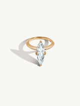 The Marei Aquamarine Engagement Ring by jewelry designer Angie Marei, showcases a stunning brilliant-cut Marquise White Aquamarine jewel enthroned in an Art-Deco-inspired claw setting. Handcrafted in 18-karat yellow gold.