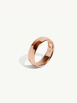 The bold and 6mm Eterno Knife Edge Wedding Ring by Angie Marei is handcrafted in solid 18-karat rose gold and finished in a high shine polish. A sparkling single white diamond is secretly set inside the band, touching the skin, offering a romantic element of surprise and a symbol of love. This ring is perfectly designed to provide a classic and refined masculine look with a comfortable fit.