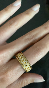 The Amanti Spinning Infinity Ring by New York jewelry designer Angie Marei is exquisitely handcrafted with great precision in luxurious platinum precious metal. This elegant design possesses an intricate pattern of brilliant pavé diamond geometric dimensional windows creating a glittering vignette that shines and reflects light from all angles.