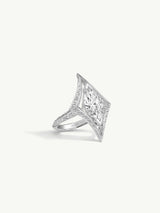 The Palmyra Diamond Ring by Angie Marei features an exquisite, brilliant marquise-cut diamond framed in a glittering pavé-set diamond mounting handcrafted in polished platinum. The inspiration for this unique design is drawn from Ancient Egyptian architecture and desert palm trees, reflecting the textures and negative spaces of its intricate details. Its elaborate design is sure to become an heirloom piece that generations of admirers will cherish.