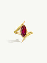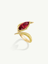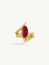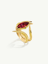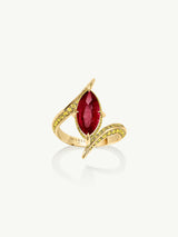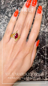 The Ayla Arabesque Engagement Ring by Angie Marei is a timeless piece that is sure to enchant with its captivating ultra-feminine design that exudes sophistication. This unique piece features a brilliant-cut marquise ruby center stone embellished with pave-set glittering vivid yellow diamonds and crafted from 18-karat yellow gold. A perfect symbol of your eternal love.