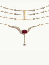 Inspired by the Ancient Egyptian phoenix and the celestial goddess Nut, the Bennu Celeste Ascension Necklace by designer Angie Marei is a tiered choker symbolizing rebirth, protection, and rising beyond past chapters. Bennu, its name meaning to rise in brilliance, honors the moment of emergence after transformation. At its center, a precious oval-cut pink tourmaline is suspended between the outstretched wings of a rising phoenix, delicately accented with white diamonds.
