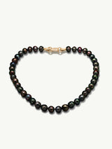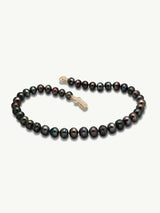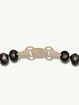 The Nyx Tahitian Black Pearl Necklace by designer Angie Marei is a daring new take on the classic pearl necklace. This unisex piece features multi-colored Tahitian Black Circle Pearls and a custom-designed hardware-inspired clasp crafted from luxurious 18k yellow gold with pavé set brilliant cut white diamonds, designed to be worn front or back, depending upon your preference.